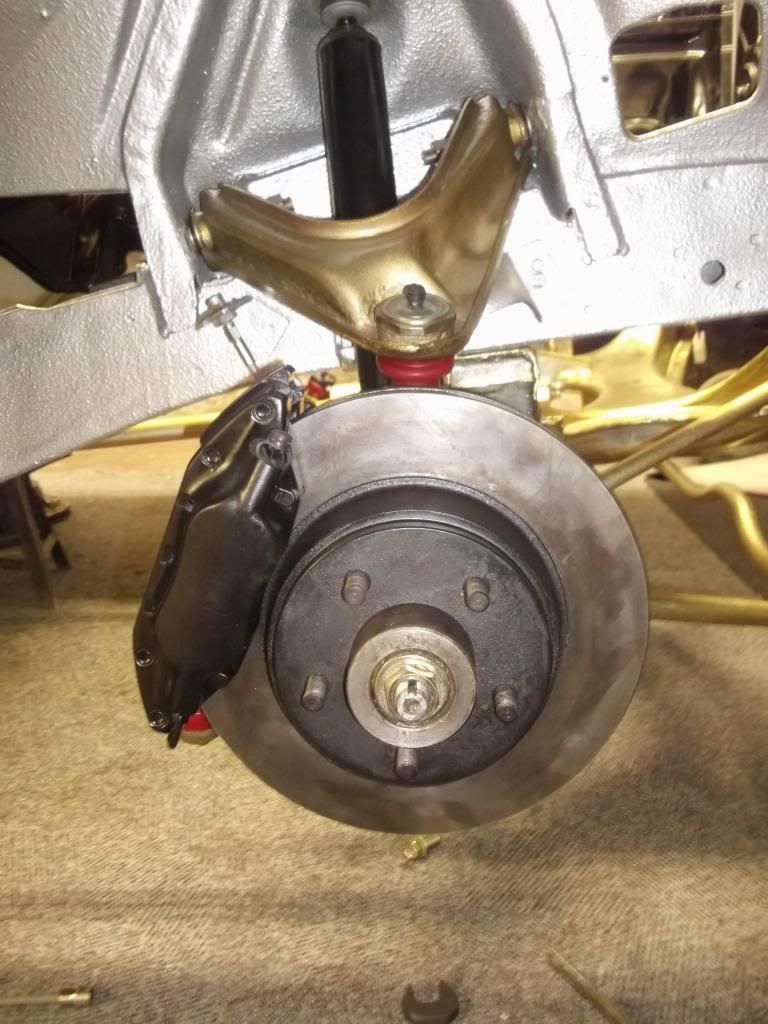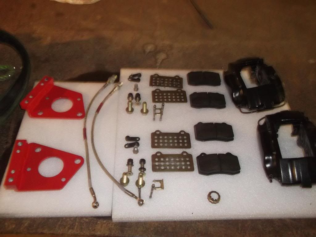 Front installed dodge viper caliper. The kit uses a spacer plate (red) to fit viper calipers. Also there are pad shim plates to bring the pad futher in. (gold with holes in )